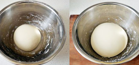 將絮狀面和成面團,反復揉面,揉至表面光滑、細膩。然后蓋上等待發酵,面團發酵至原來的2倍大,就發酵好了。