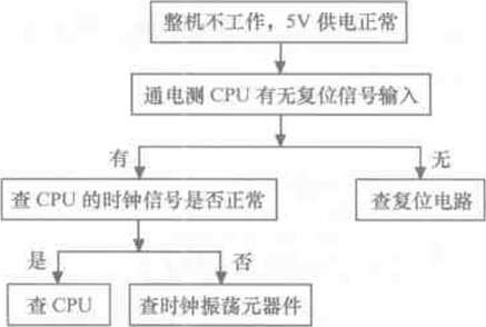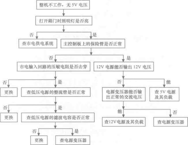 整機不工作是指插好電源線后壓縮機不運轉(zhuǎn),顯示板上的指示燈或顯示屏也不亮,該故 障主要是由于市電供電系統(tǒng)或主控制板異常所致。該故障根據(jù)有無5V電壓又有所不同,沒 有5V電壓說明市電輸入系統(tǒng)、主控制板上的低壓電源電路異常:若5V供電正常,說明CPU 電路異常。整機不工作.5V電壓的故障檢修流程如圖8-9所示:整機不工作,有5V電壓 的故障檢修流程如圖8-10所示。